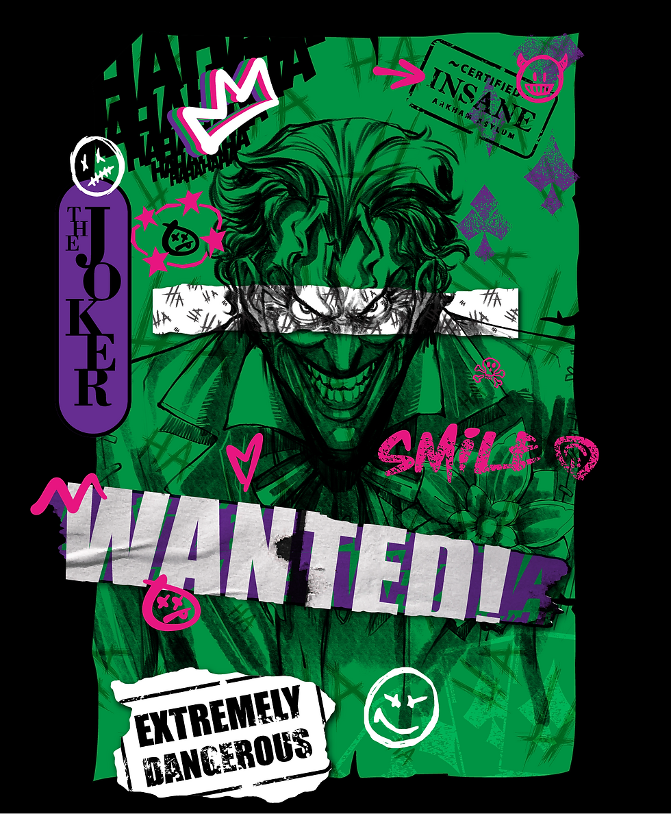 At Warner Bros. Discovery, I created fast-fashion style guides with quick turnaround times. After researching current trends, I designed animated mood boards to showcase each concept. Two standout guides included "The Joker Punk Revival," blending punk anarchy with hand-drawn sketches and collage, and a "Candy Coloured" Gremlins guide, incorporating Asian-inspired design and pastel tones to reflect the characters' playful energy and love of food. These guides were adopted by major retailers like Primark and M&S.